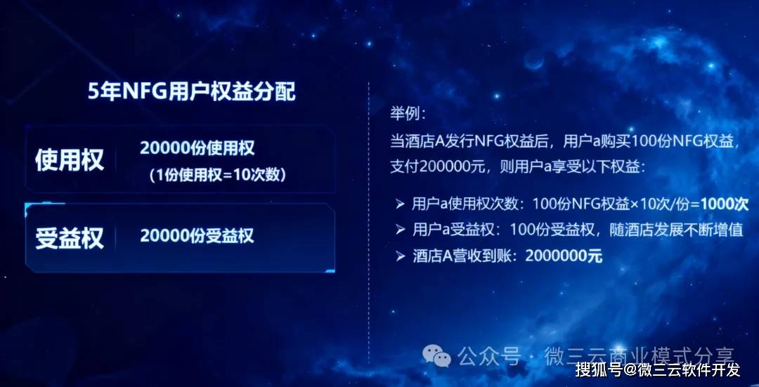 (2)、NFG 是 “权益绑定卡”:1 份就对应 “10 次住宿 + 5 年分红”,还能拆分 —— 比如你只想买 5 次住宿,就能拆成 0.5 份,2000 元就能参与,不用花几百万买酒店股权。