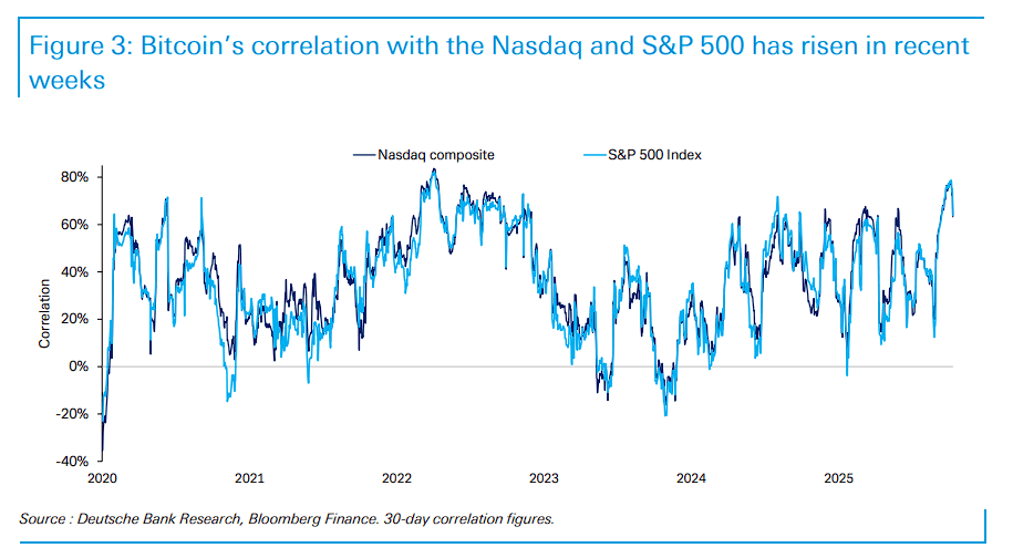 比特币目前回升至约9万美元上方,相当于2025年5月的价格。然而,其波动性已从8月份的低点20%飙升至39%,与纳斯达克和标普500指数的相关性也升至46%和42%,重新表现出高风险资产特征而非避险工具。德银分析师指出,这种小叮当效应(Tinkerbell effect)表明比特币估值仍很大程度上依赖于信念驱动的采用。