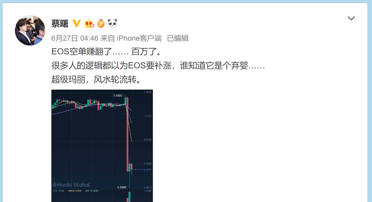亏损是所有投资者必交的学费。二八定律放在哪里都是有效的,金融市场本就波动剧烈,数字货币市场亦是如此。赚钱的永远只有少数,亏损的是绝大多数。像蔡曙自己开空,根本不是如外界猜测的那样非要和大势作对来炒作,仅仅只是因为担心有可能下跌导致现货亏损做的对冲操作。
