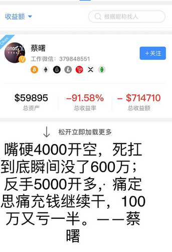 不少投资者甚至放下话来,蔡总开什么,我们就反着开!蔡曙对此并不恼怒,继续开单然后继续爆仓,越战越勇。也伴随着越来越多关于蔡曙是富二代的消息甚嚣尘上,如果不是家里有矿,这种亏法谁能抗的住?